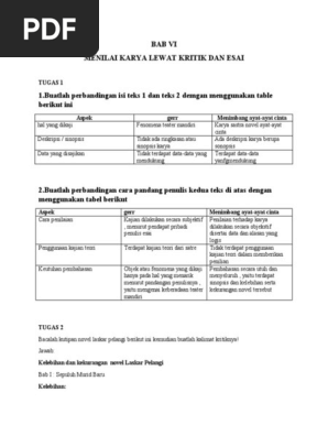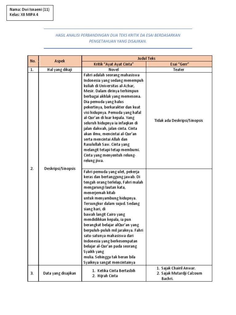 Selain itu, tentang penokohan juga dibahas dalam teks tersebut. Tidak ada ringkasan atau sinopsis karya. Salju telah mencair, habis tak tersisa. Teks kritik sastra dan esai juga memiliki karakter khas yaitu gaya bahasa berupa pilihan kata, struktur kalimat, dan gaya penulisannya merupakan hal yang berkaitan erat dengan penulis kritik sastra dan esai secara pribadi. Keduanya ditinjau dari level teks, level kognisi sosial, dan level konteks sosial. Ikhwannudin alamsyah (15) xii mia 1 membandingkan kritik dan esai buatlah perbandingan isi teks 1 dan teks 2 dengan menggunakan tabel berikut ini. Sebuah peristiwa budaya biasa dari tradisi bangsa ini. Menurut saya novel ayat ayat cinta ini ceritanya sangat menyentuh. 1 ياأيّها النّاس اتّقوا ربّكم الّذي خلقكم من نفس واحدة وخلق منها زوجها وبثّ منهما رجالا كثيراونساء. Hal yang dikaji deskripsi/sinopsis data yang disajikan 2. Matahari redup di petala langit. Buatlah perbandingan isi teks 1 dan teks 2 dengan menggunakan table berikut ini. Resensi novel ayat ayat cinta 1.