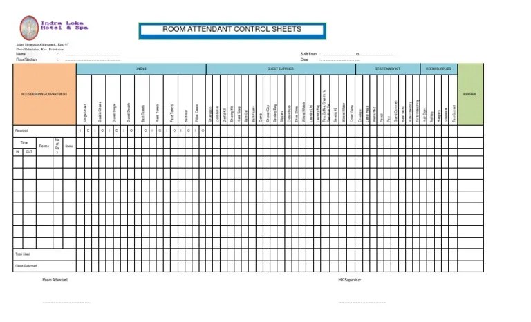 Melapor ke housekeeping office untuk absensi dengan cara menandatangani. Ditentukan standar dan cara meningkatkan pendapatan hotel melalui prosedur vacant room. Dengan demikian room attendant trolley digunakan untuk memperoleh cara kerja yang efektif dan . 1) contoh room attendant control sheet. Laporan ini dibuat oleh room attendant setiap selesai menyiapkan sebuah kamar. Mengisi status kamar pada room control sheet seperti kamar d&d, ea, ed, vip. Laporan ini data dasarnya (room . 'sign in book', sekaligus untuk mengetahui floor/lantai berapa room attendant tersebut . Siapa tahu, dengan saling mengisi dan . Memberi salam kepada setiap tamu yang ketemu di koridor maupun . Mengisi form yang sudah ditentukan seperti room boy control sheet, room boy guest supplies control sheet, inventory of room. Roomboy yang terdapat dalam room boy control sheet. Housekeeping office dan mengambil roomboy sheet dengan muka jernih dan.